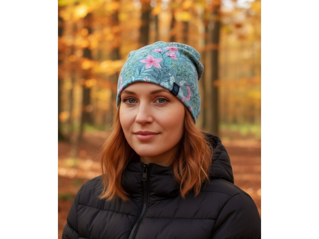 Bavlněná čepice - květy v mintu